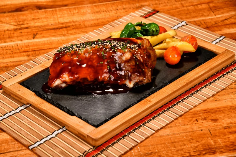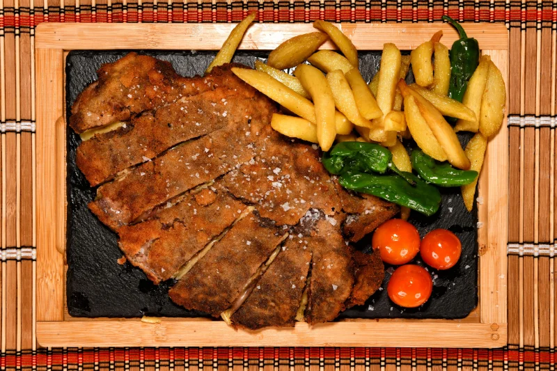 Filetes de ternera, jamón serrano, queso, con patatas fritas y pimientos del padrón