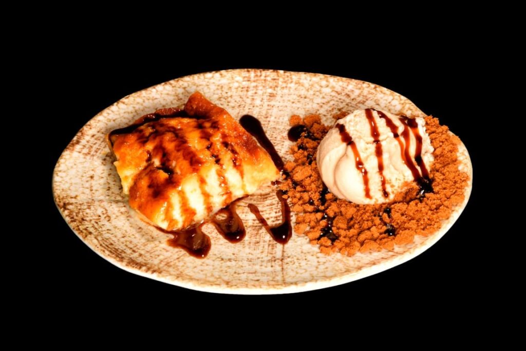 Jugoso brownie de chocolate y nueces con mini cookies, helado de vainilla y Nutella
